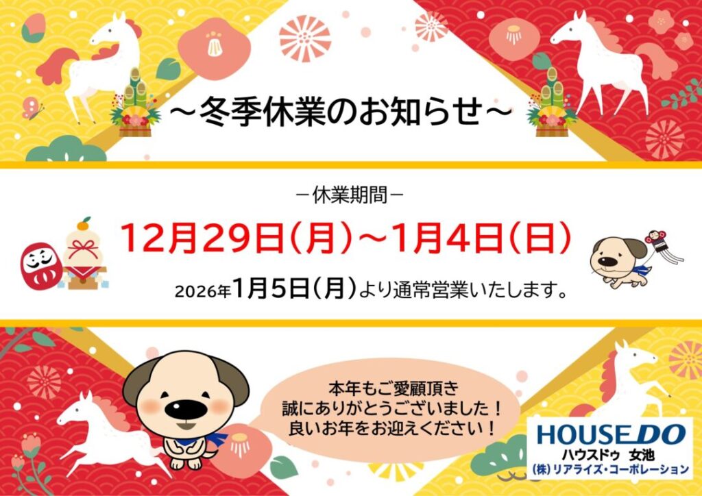 ~冬季休業のお知らせ~ 平素は格別のお引き立てを賜り、厚く御礼申し上げます。下記の通り、冬季休業期間に関してご案内申し上げます。誠に勝手ではございますが何卒ご了承くださいますようお願い申し上げます。 【休業期間】2025年12月29日(月)~2026年1月4日(日) 期間中に頂きましたお問合せに関しましては2026年1月5日(月)より順次対応させて頂きます。皆様のご来店、心よりお待ち申し上げております。 投稿日:2025.12.28 | カテゴリー:お知らせ