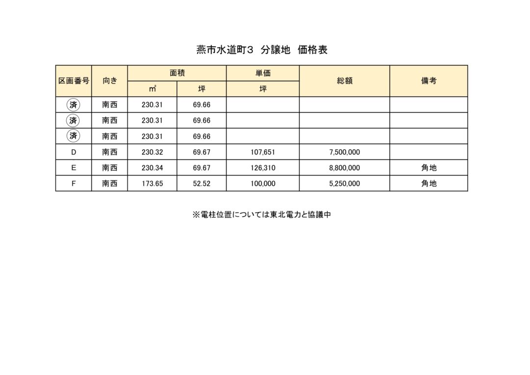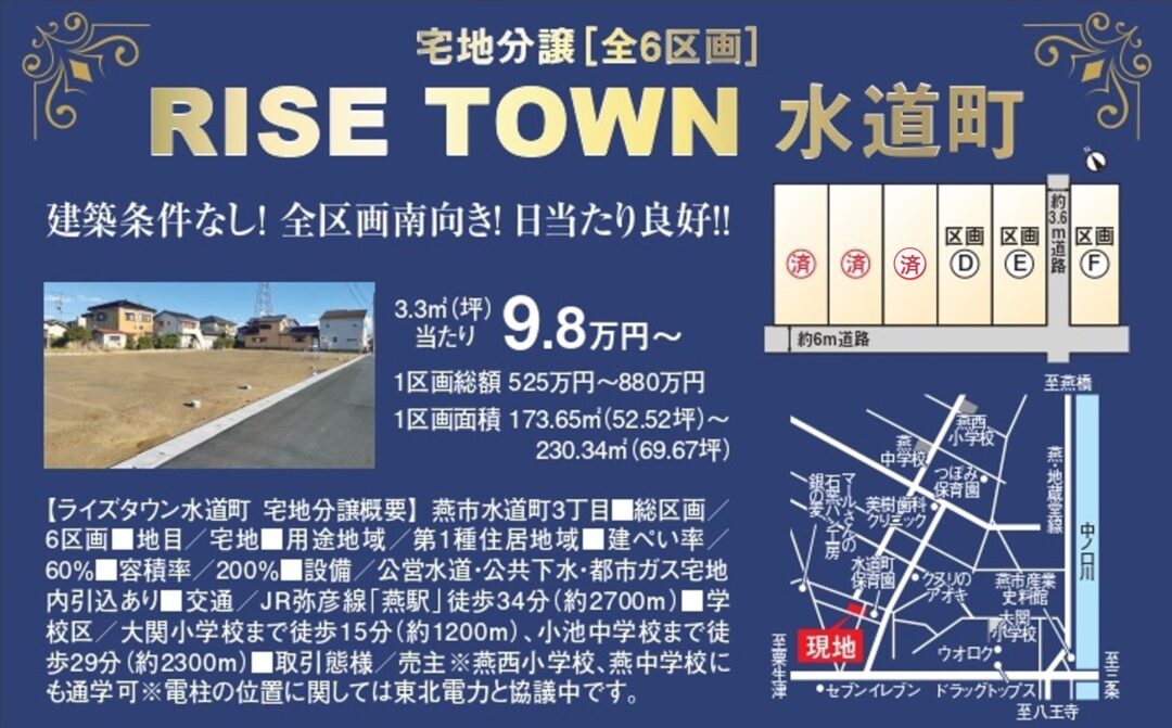 その他 | RISETOWN水道町 ■燕西小学校(約1590m:徒歩約20分)/燕中学校(約1001m:徒歩約13分)にも通 学可能です(※要許可) *造成工事完了済 *電柱の位置に関しては東北電力と協議中です *道路(区画EとFの間):水道町3丁目26号線、幅員約3.6mは建築基準法の道路に該 当しません *燕市立地適正化計画の居住誘導区域外です ○上水道(公営水道) ○下水道(公共下水) ○ガス(都市ガス) |