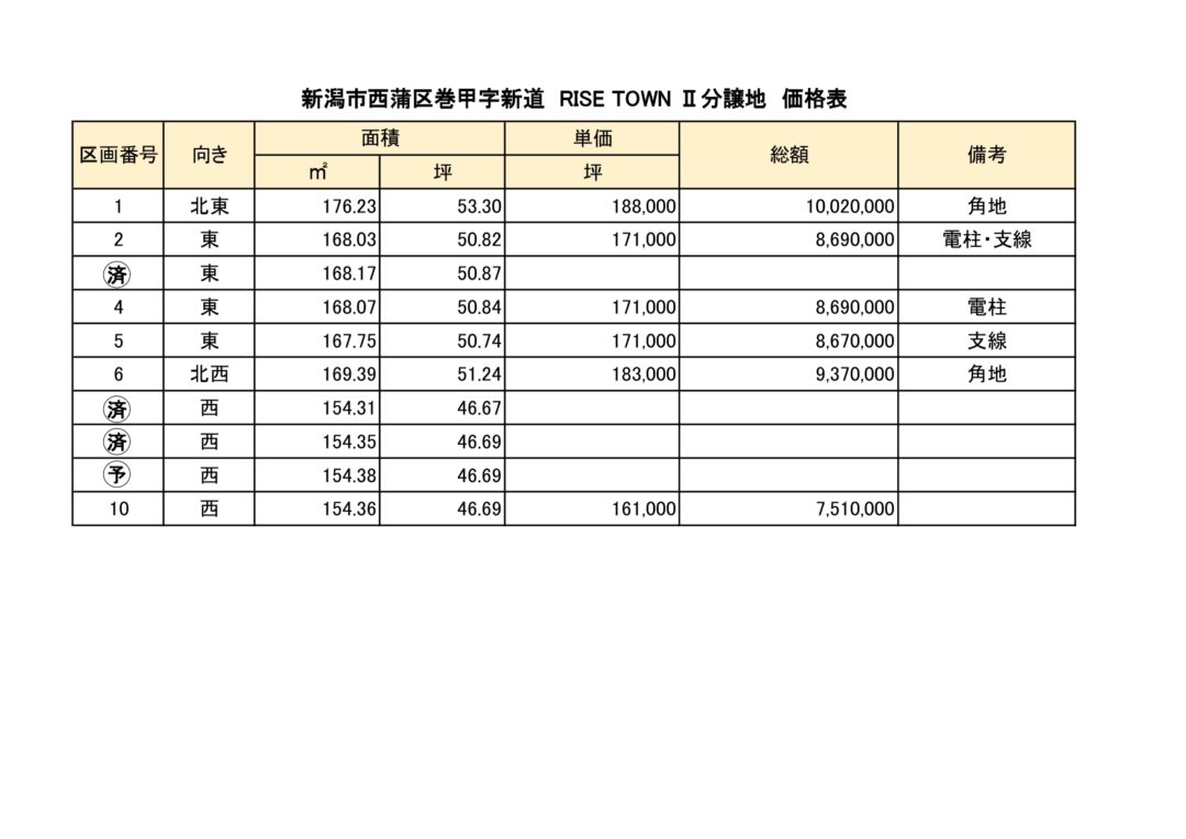 | その他 | RISETOWN巻II *造成工事完了(令和6年7月) *開発道路(私道負担持分各10分の1) *区画⑥隣接にゴミ集積場設置予定 ○上水道(公営水道) ○下水道(公共下水) ○ガス(都市ガス) ○電気(東北電力) |