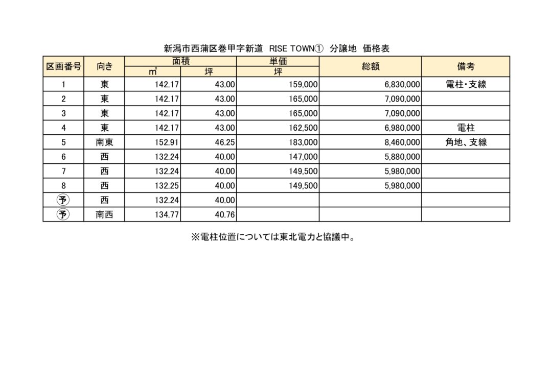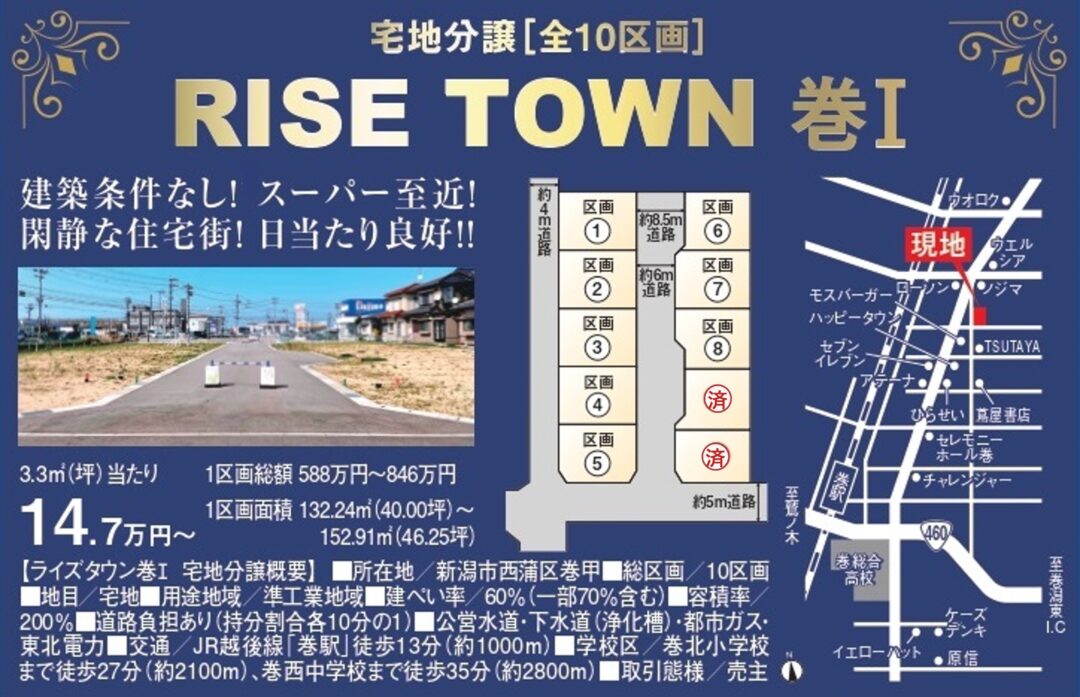 | その他 | RISETOWN巻I *造成工事完了(令和6年6月) *区画により電柱及び支線が入ります *合併処理浄化槽整備地域 *開発道路(私道負担持分各10分の1) ○上水道(公営水道) ○下水道(浄化槽) ○ガス(都市ガス) ○電気(東北電力) |
